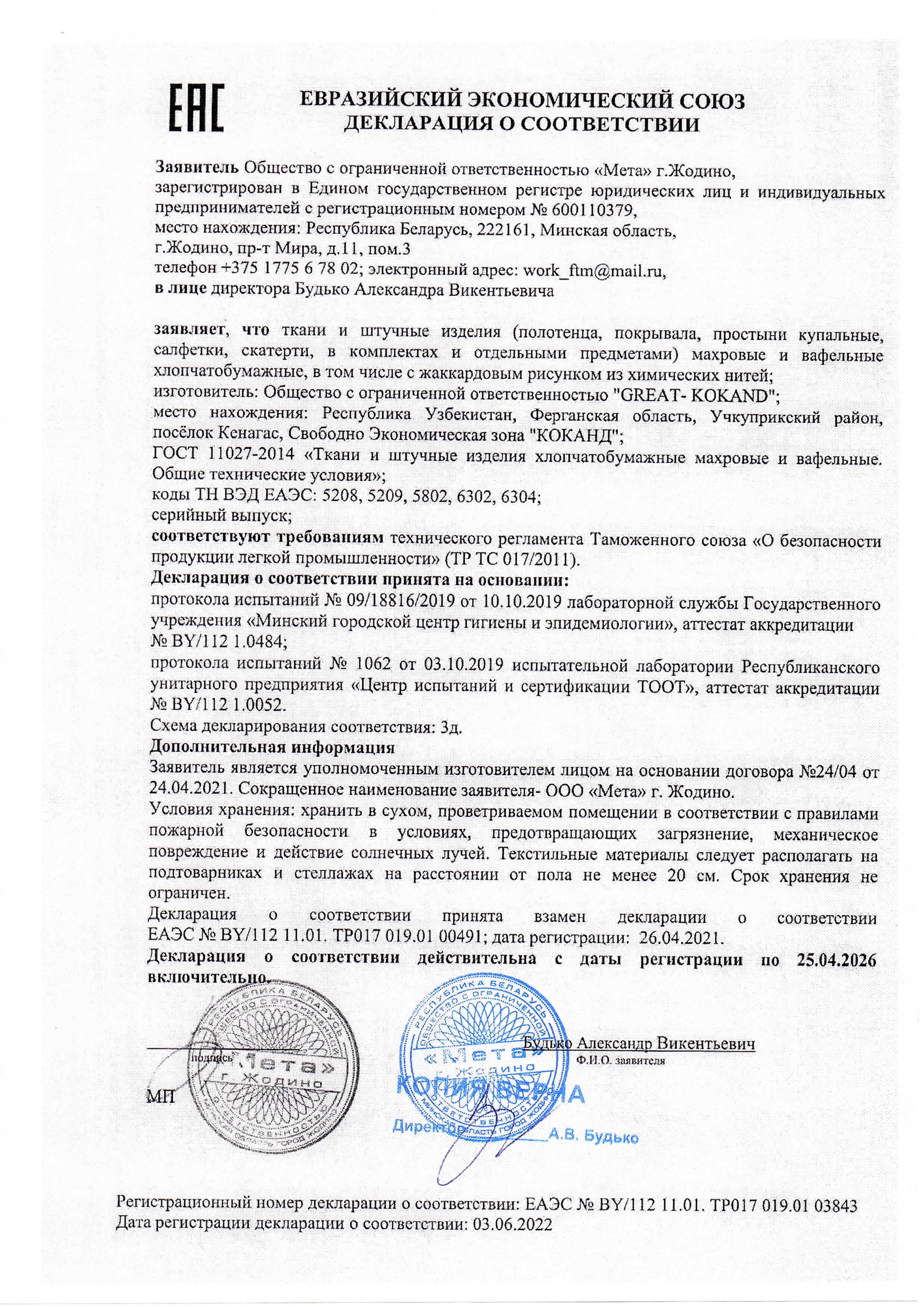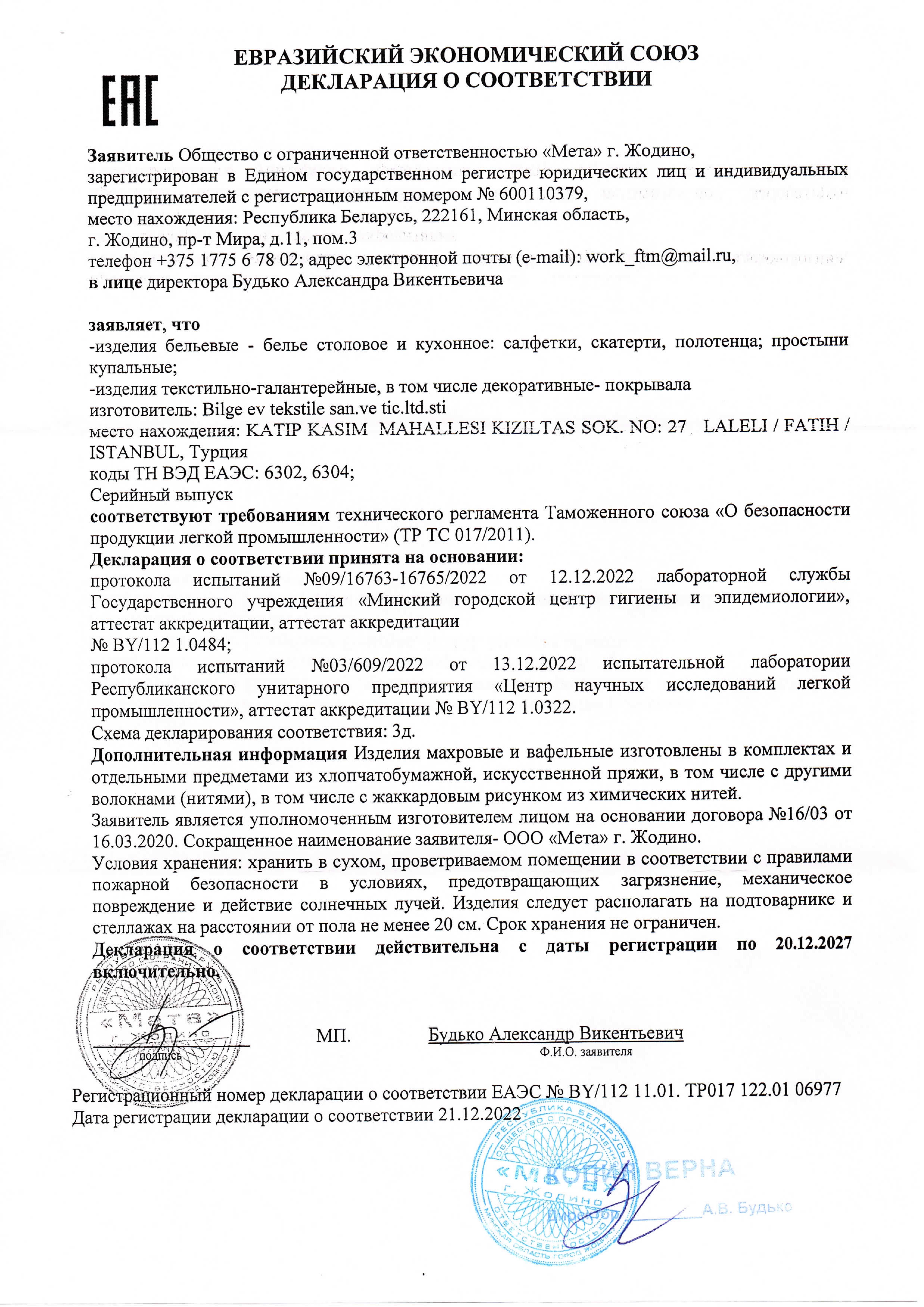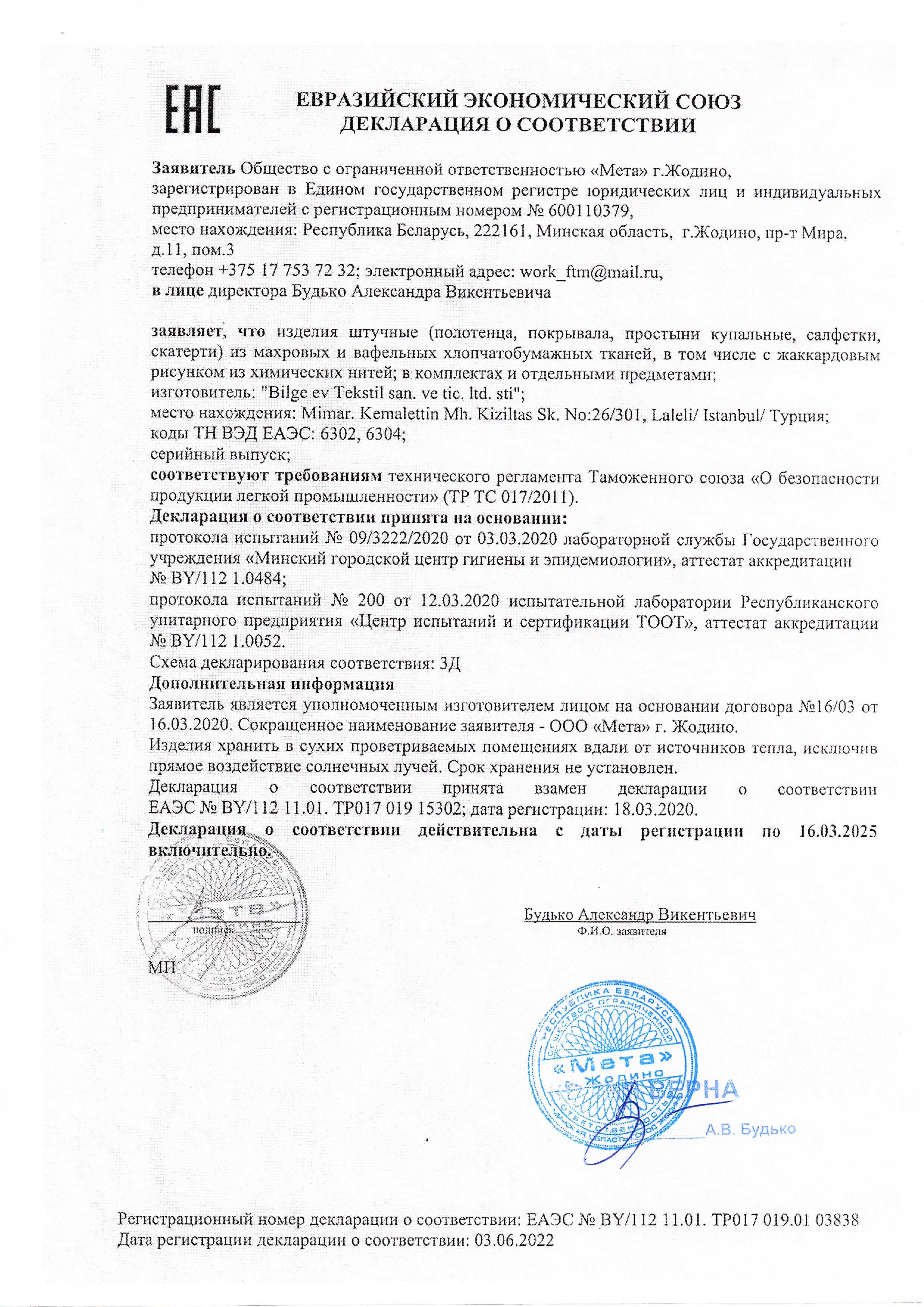 Декларация о соответствии на постельные принадлежности для детей и подростков