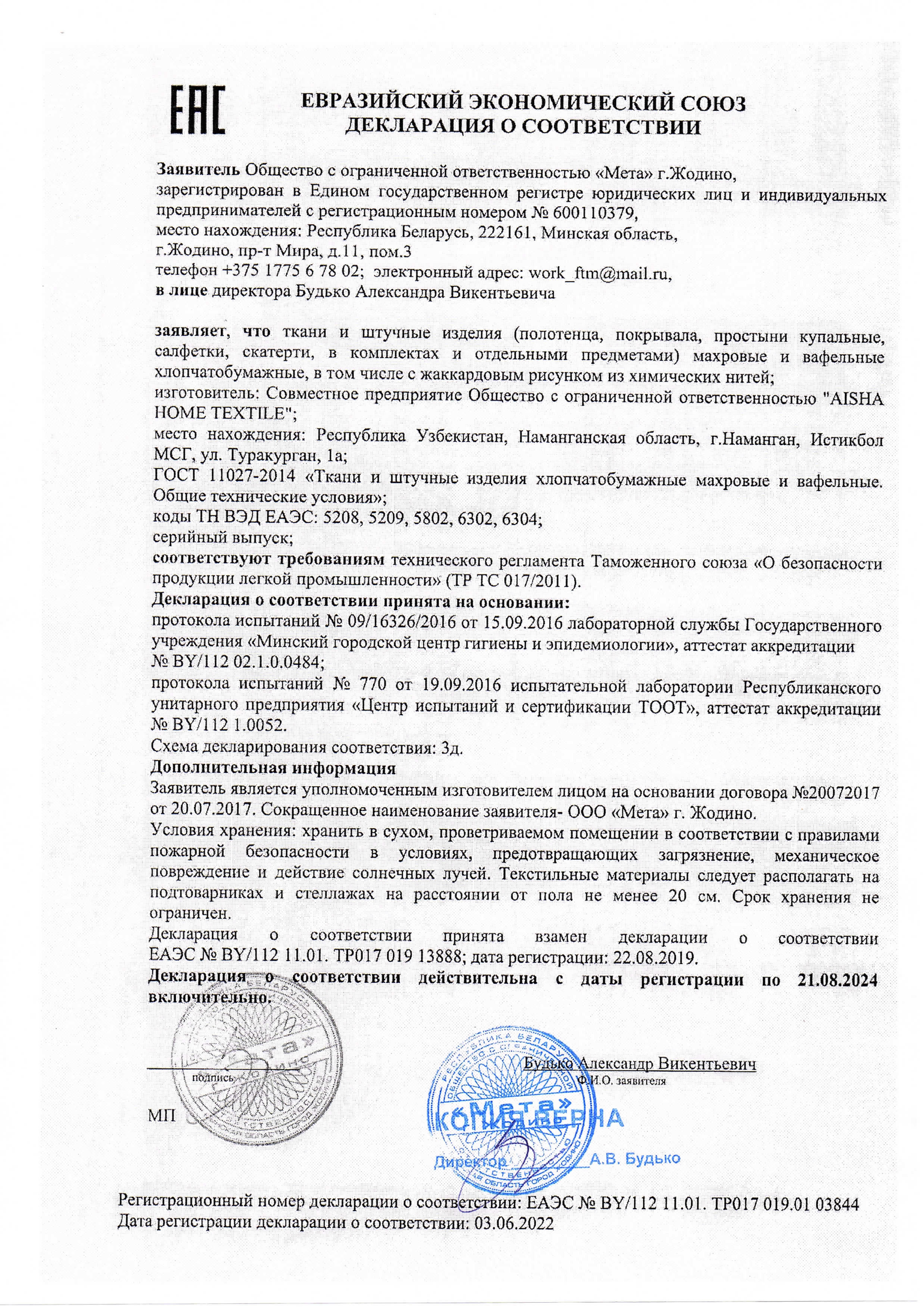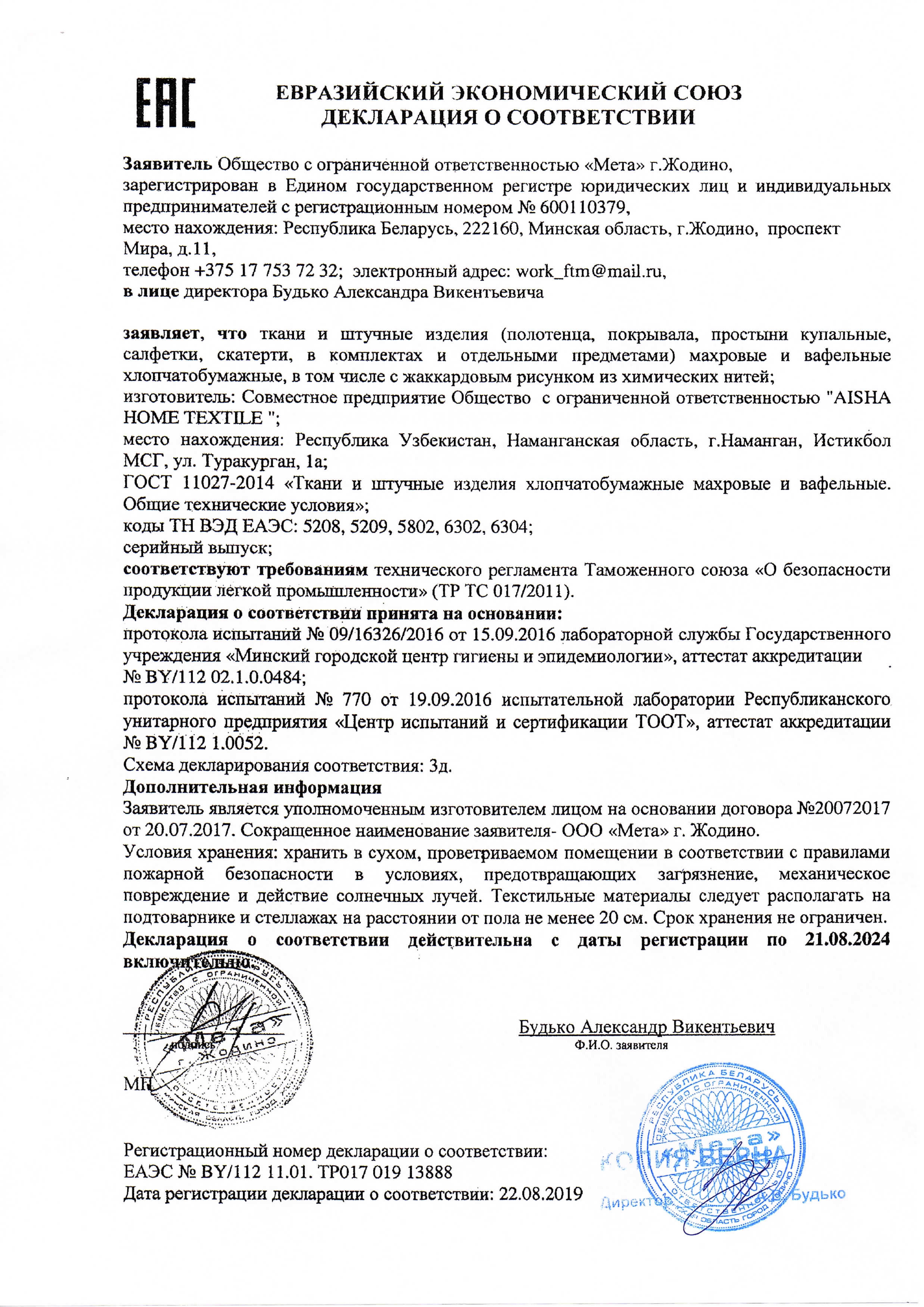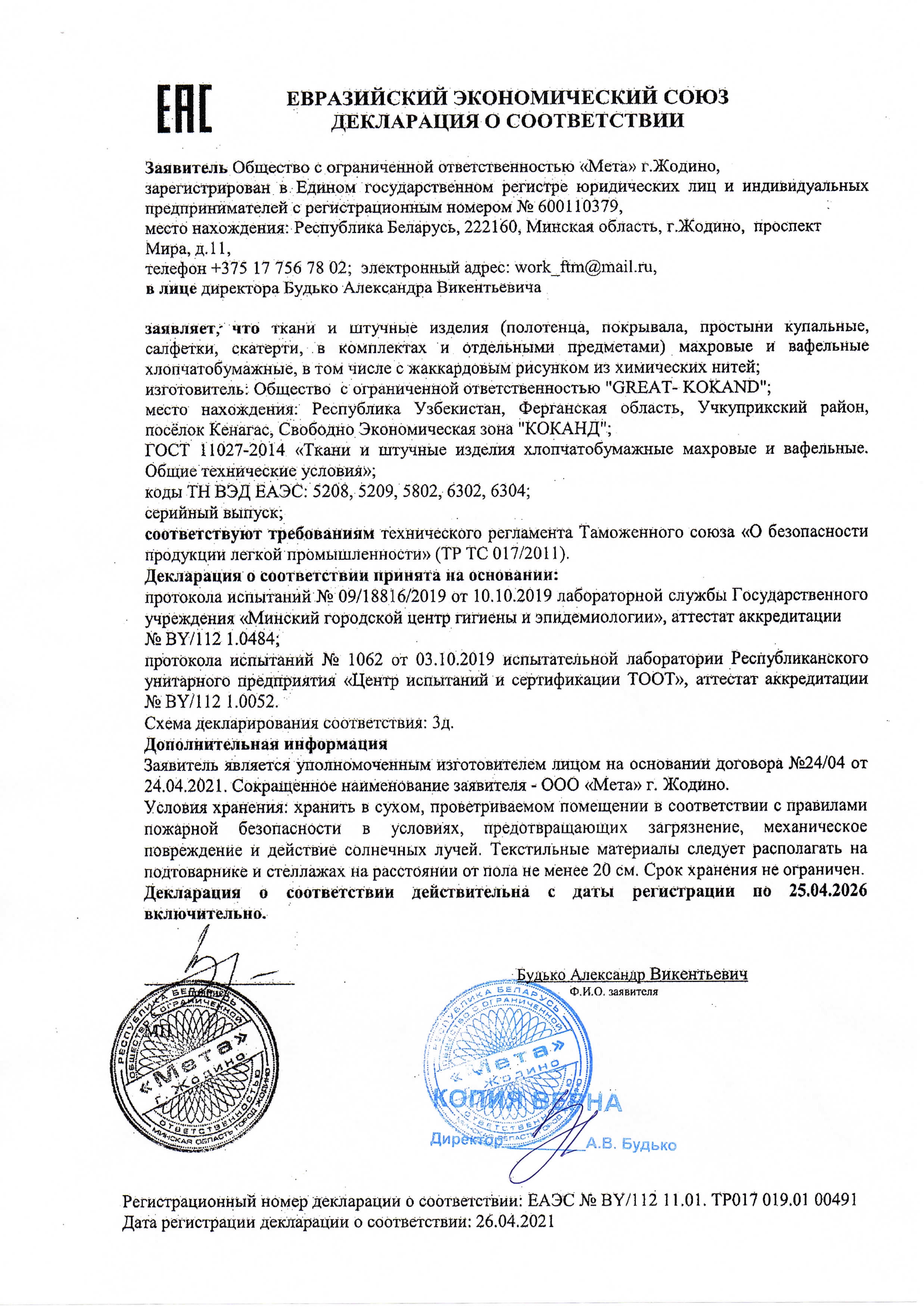 Декларация о соответствии на постельные принадлежности для детей и подростков